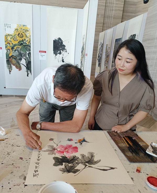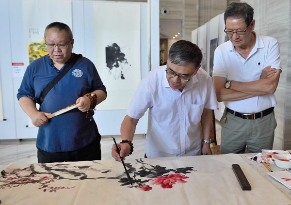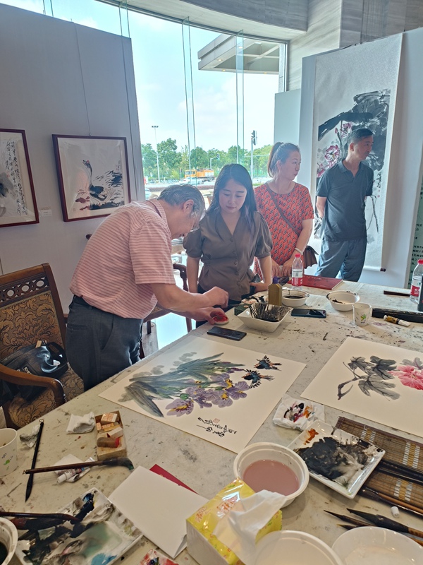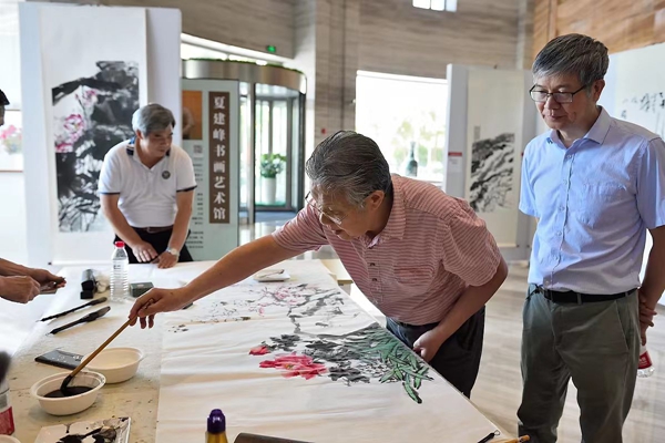 來自上海各區(qū)的花鳥畫藝術(shù)沙龍畫家冒著酷暑驅(qū)車來到園區(qū)參加畫展開幕活動。上午九點(diǎn)剛過有許多愛好者來到現(xiàn)場觀看畫展。先到的畫家開始動筆為觀眾示范,過了一會觀眾越來越多,活動進(jìn)入了高潮。