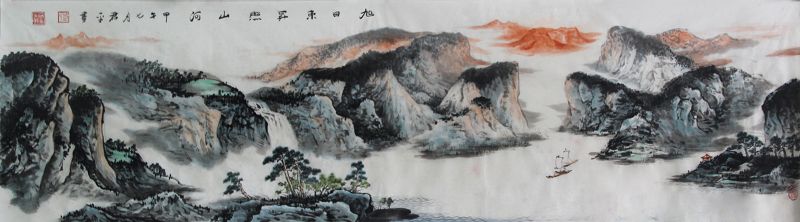 旭日東升照山河 紙本彩墨 180cmx50cm 2014年