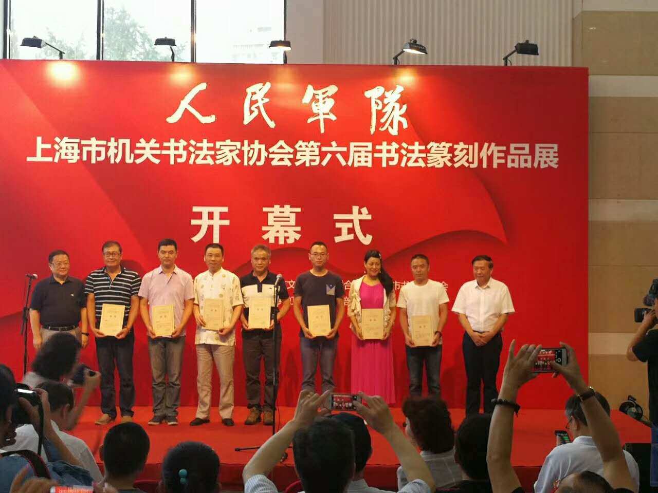 翰墨與軍魂,共筑強軍夢。由市機關書法家協會、中共虹口區委宣傳部共同主辦的人民軍隊——紀念中國人民解放軍建軍90周年書法纂刻作品展,于8月11日上午在上海圖書館隆重開幕。中共市委宣傳部副部長胡勁軍、市文聯專職副主席遲志剛、市國防教育基金會理事長劉健、市政協民宗委專職副主任徐梅、中共虹口區委宣傳部部長吳強、市書法家協會副主席徐正濂、張偉生、李靜、丁申陽、宣家鑫、徐慶華、王國賢、晁玉奎、副秘書長李俊、辦公室主任鄭振華市機關書協副主席吳申耀、張培基、副秘書長陳挺、江鵬及此次展覽的獲獎入展人員、書法愛好者200余人出席了展覽開幕式。