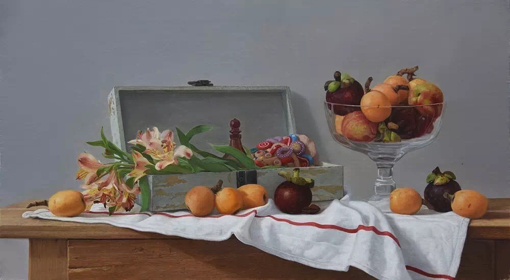 作品多以平凡生活為鋪墊,尤善物品之刻畫,在油畫領域中獨樹一幟。其造型沉穩細膩,色彩典雅,描摹精致;其畫風精美柔和,色調溫潤,不拘一格;其畫意清新自然,風格獨特,極具藝術性和觀賞性。