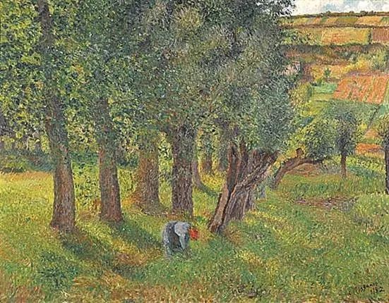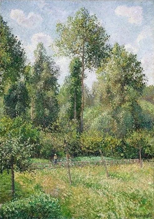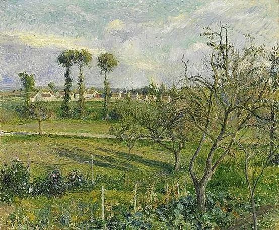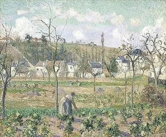 樹木的垂直效果,與田野的低矮,二者之間的對(duì)比關(guān)系,形成簡(jiǎn)單的結(jié)構(gòu),把畢莎羅與其他印象派畫家的繪畫區(qū)別開來(lái),使畢莎羅的繪畫具有一種寧?kù)o、沉思感,而不再有"印象派"的緊張氣氛。