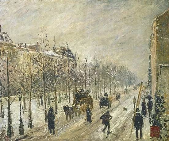 畫面中街道寬廣,行人與馬車都是速寫而成的,簡(jiǎn)練、靈動(dòng),景物朦朧模糊、跳躍閃動(dòng),各種暖灰、冷灰、深灰、淺灰構(gòu)成一幅格調(diào)高雅的城市風(fēng)景。