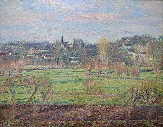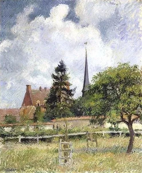 在這幅畫中,畢莎羅恰如其分地確定好形態(tài),只用了少數(shù)幾種色彩,而那些濃郁的色調(diào)卻能顯現(xiàn)出水晶般清澈的畫面來(lái),而且還呈現(xiàn)出天空里無(wú)盡的深淺層次,重疊交錯(cuò)又分外清晰。