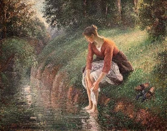 在這幅作品中,我們明顯感覺到運(yùn)用柯洛的表現(xiàn)手法創(chuàng)作,單純清新的藍(lán)綠色調(diào)和樸素優(yōu)雅、帶有古典韻味的幽靜氣氛顯而易見,畫法沉穩(wěn),雖有柯洛影響,但仍然是畢莎羅的。