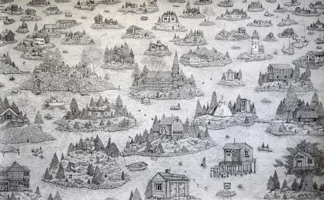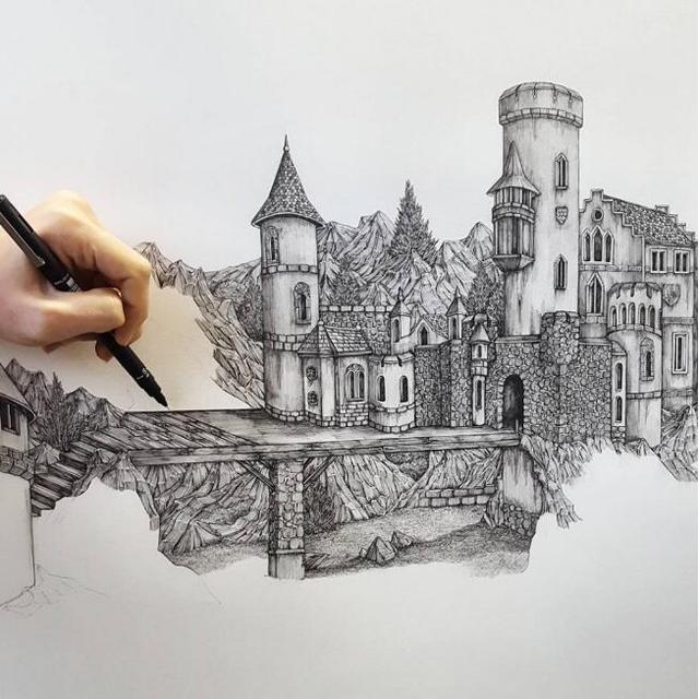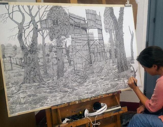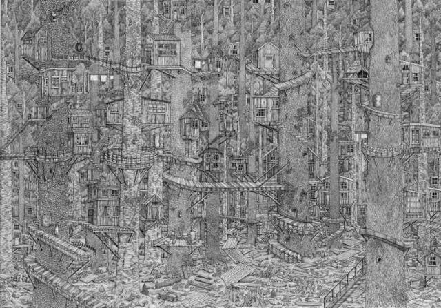 Olivia Kemp的作品大部分是來自她的想象,將現實場景在腦海中加工后再呈現在畫面上。從作品中可以看到密集的村莊、大森林中扭轉的樹屋,每個場景都像是與世隔絕的另類文明。