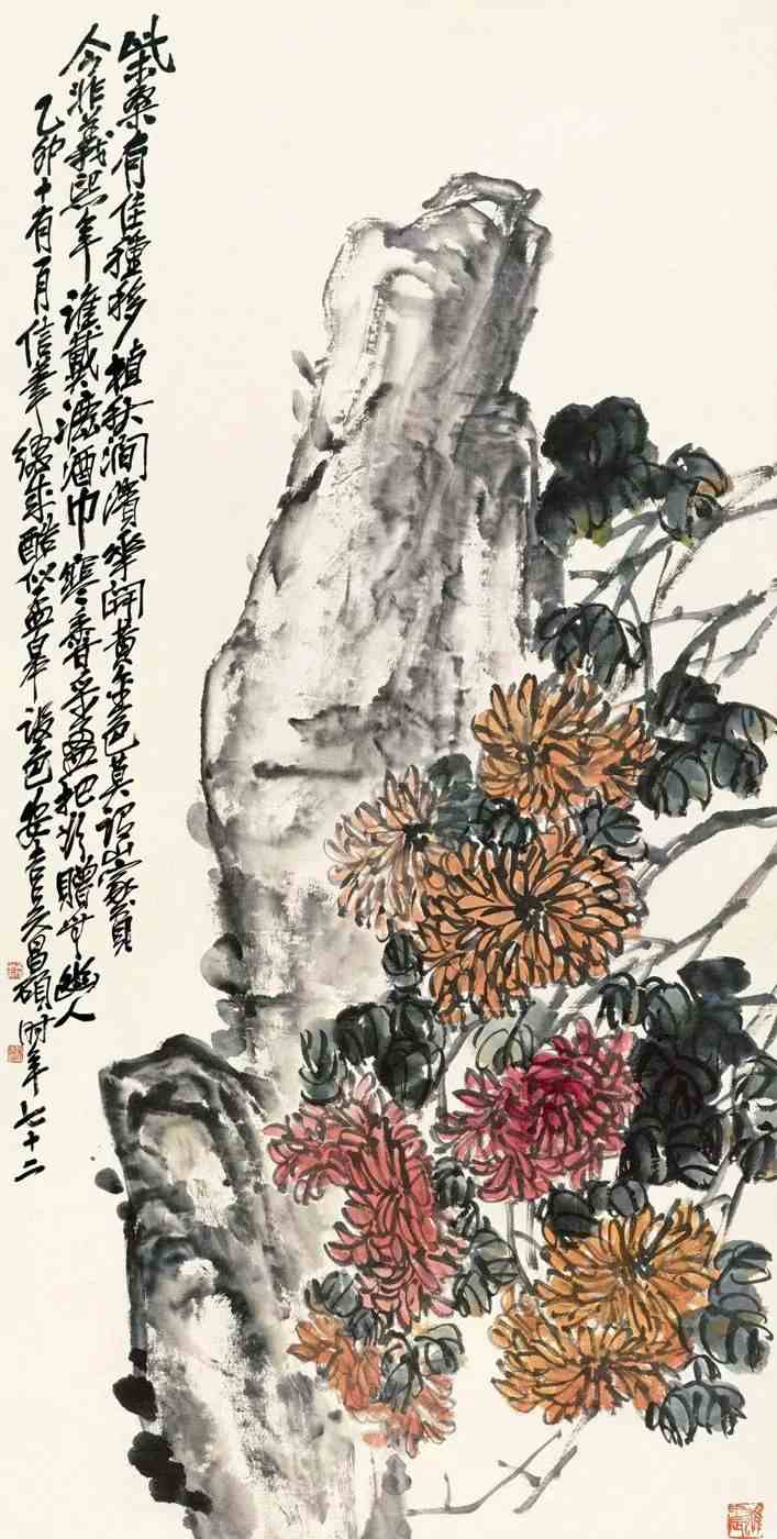 此幅《金秋盛菊》,為吳昌碩72歲所作,正值盛年,真力彌漫。