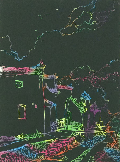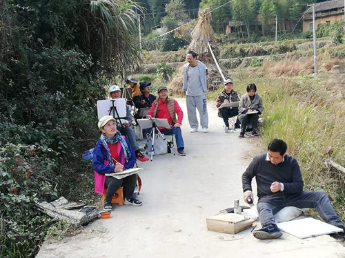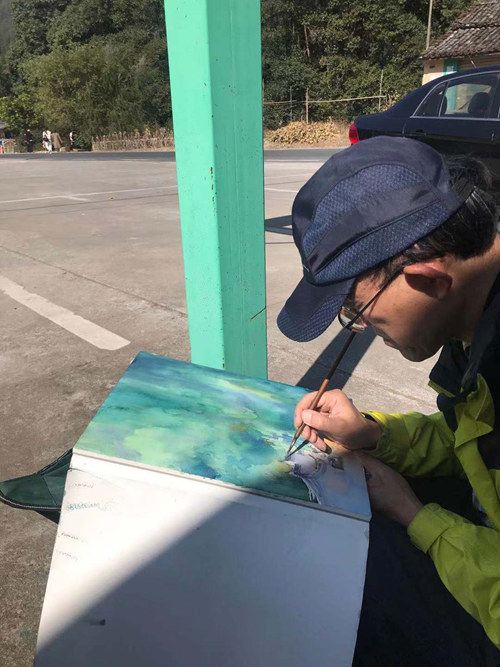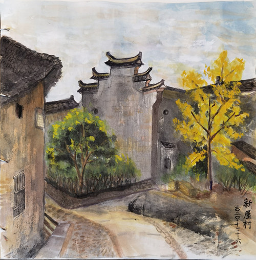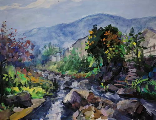 大巴一路駛進山溝,雖值初冬,然秋色斑斕,層林盡染,空山鳥語。鄉村正修道路,駛到梅后,筑路進不了外斜,便在平嶺村頭散開寫生隊伍。