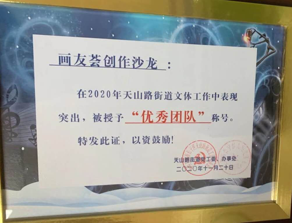 周榮主任頒發由天山街道授予畫友薈創作沙龍“優秀團隊”的榮譽證書。夏建峰代表沙龍接受了證書。